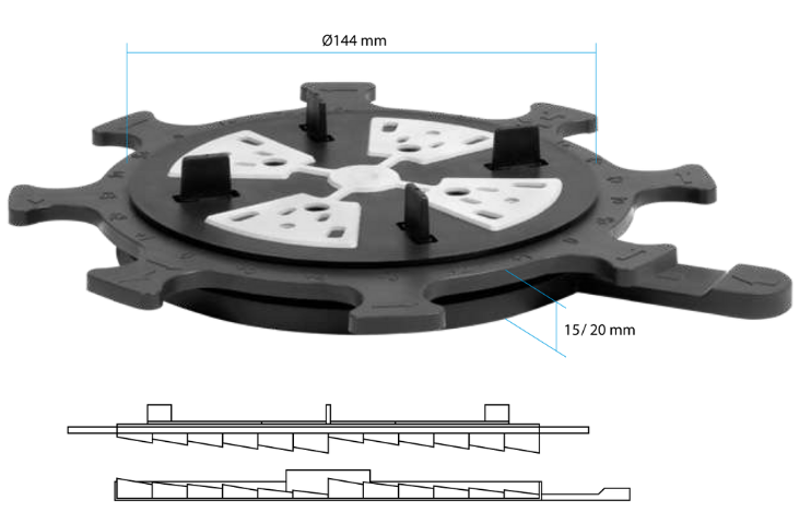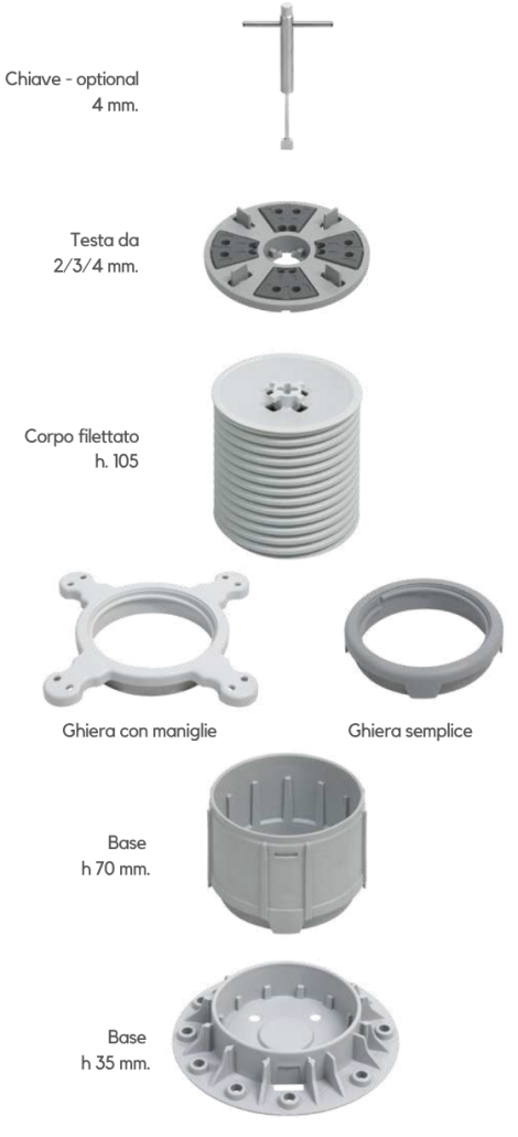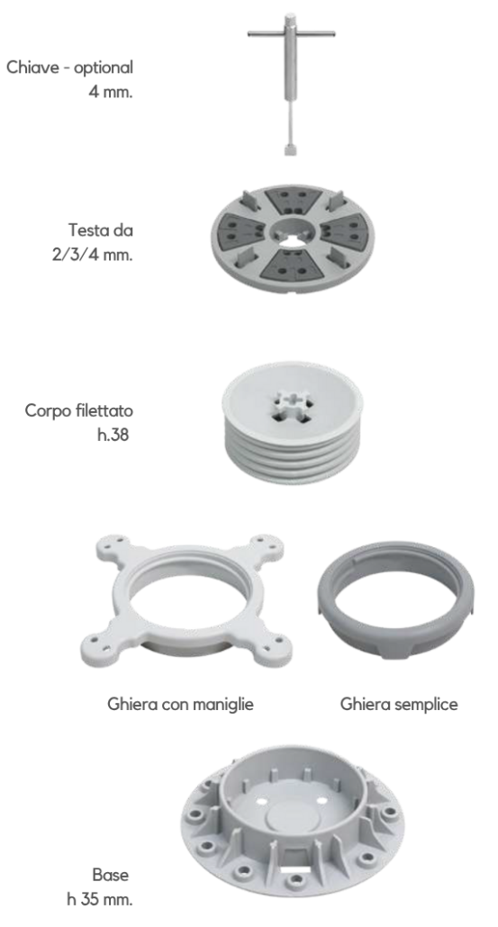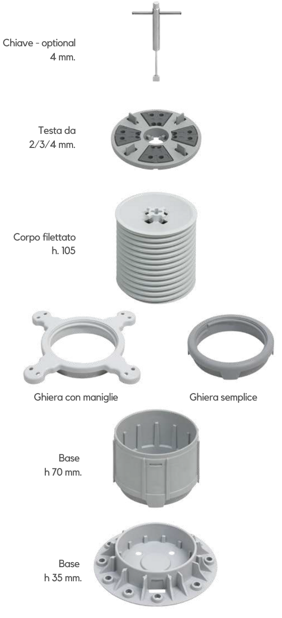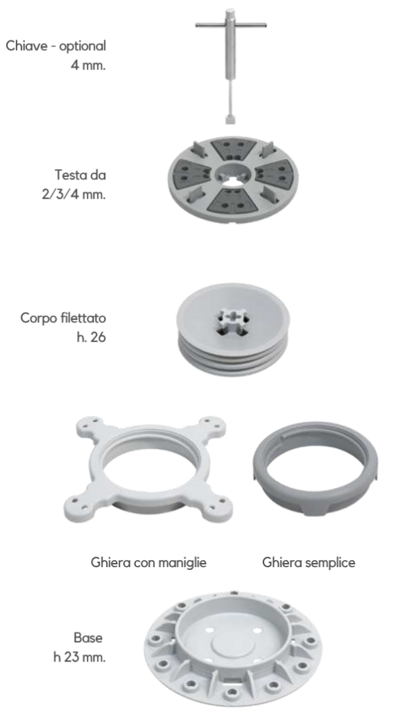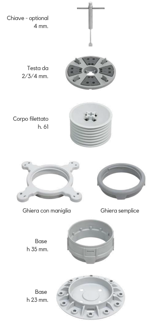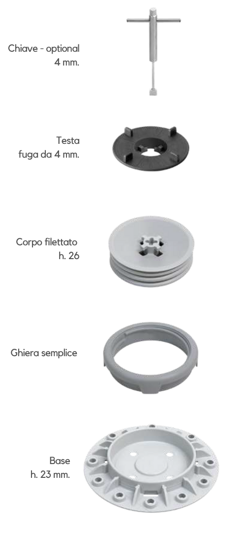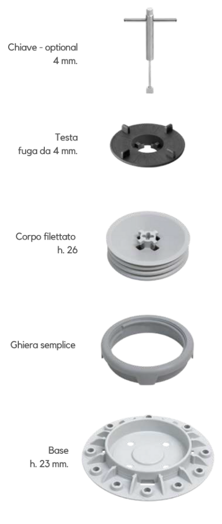 Il sistema è dotato di una vasta gamma di accessori che lo rendono estremamente versatile: è possibile adattarlo a qualsiasi tipo di posa, regolare la larghezza delle fughe e impiegarlo con diversi materiali e su fondi con inclinazioni variabili. Questa flessibilità lo rende adatto sia per nuove realizzazioni che per interventi di riqualificazione.