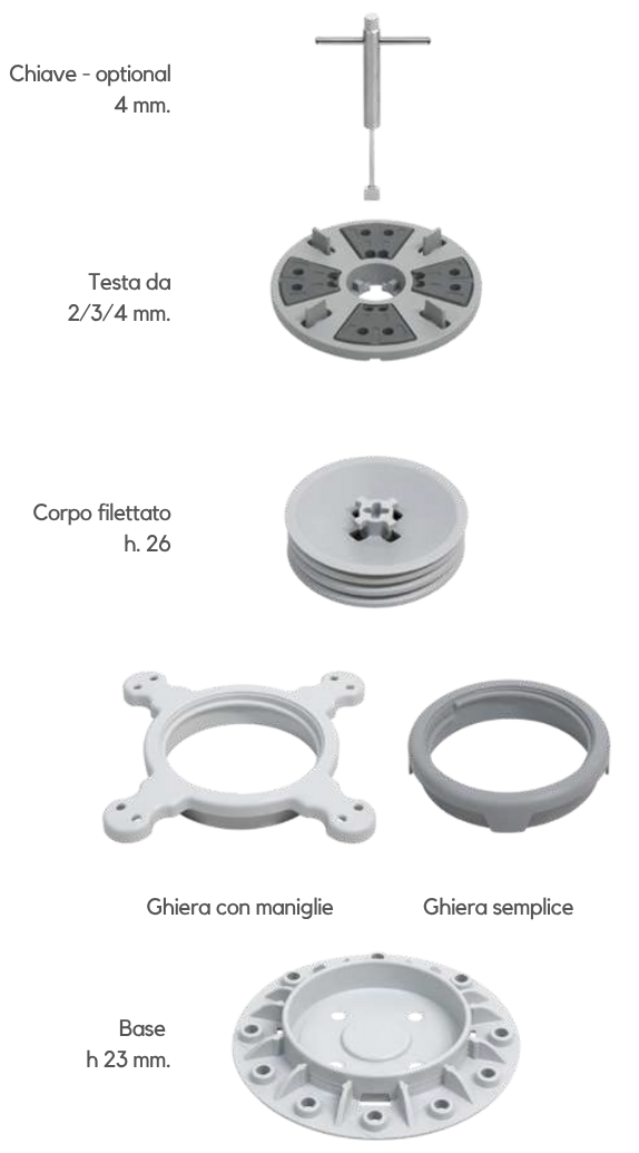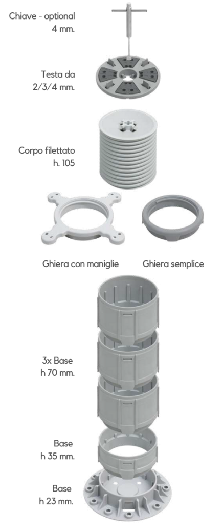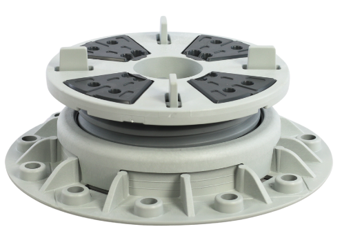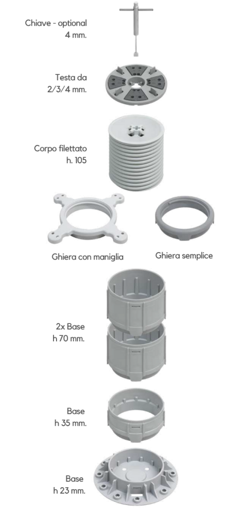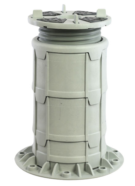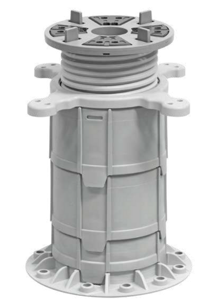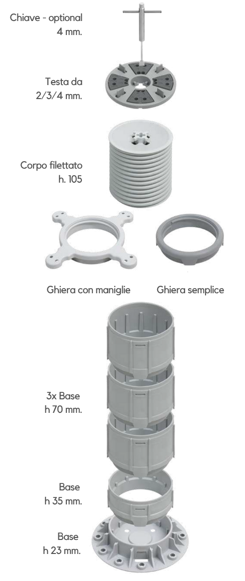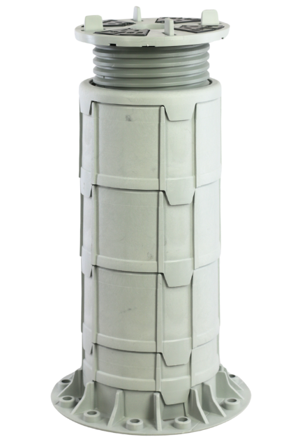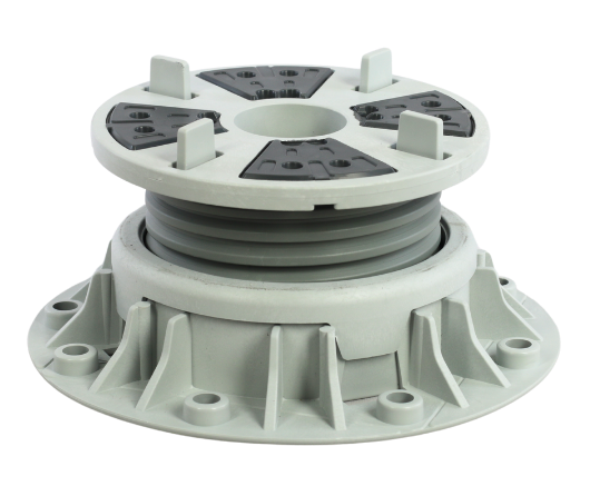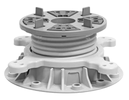 Supporto regolabile per pavimenti composto da tre moduli e un’estensione agganciabile.
