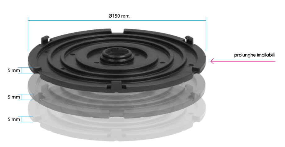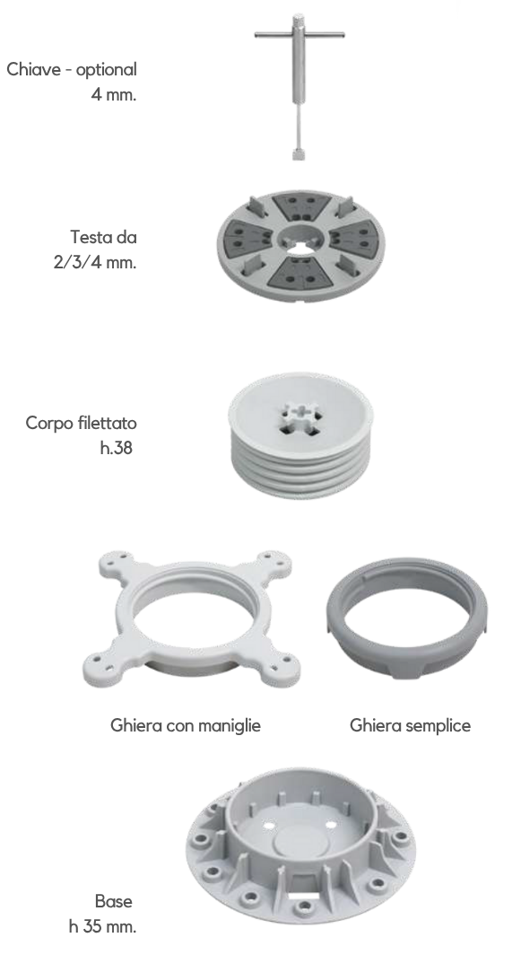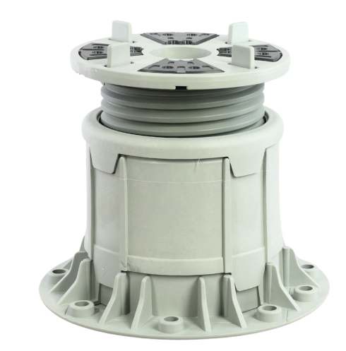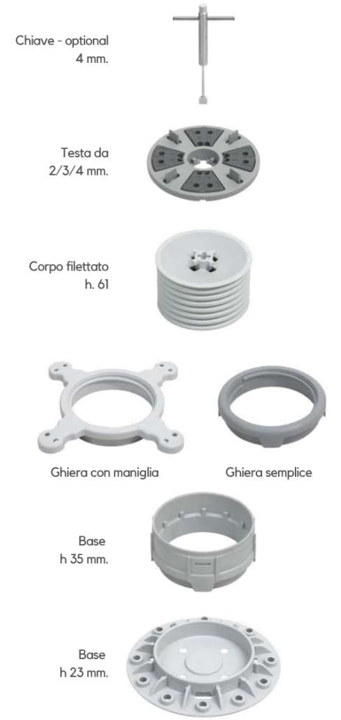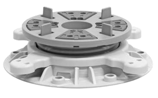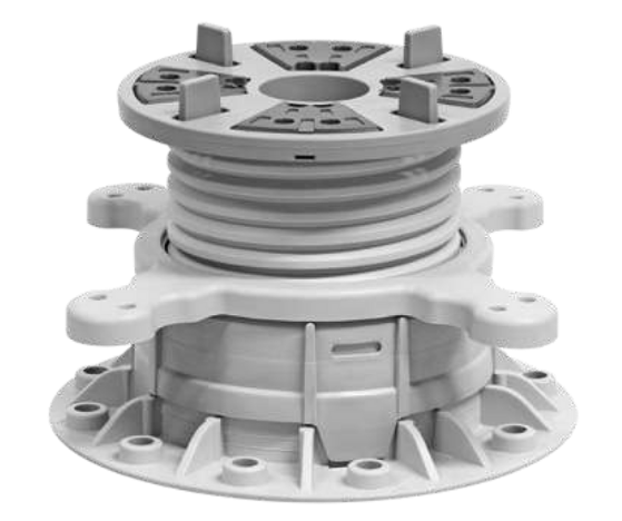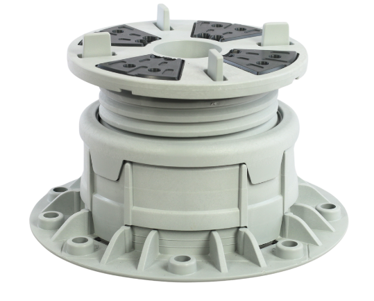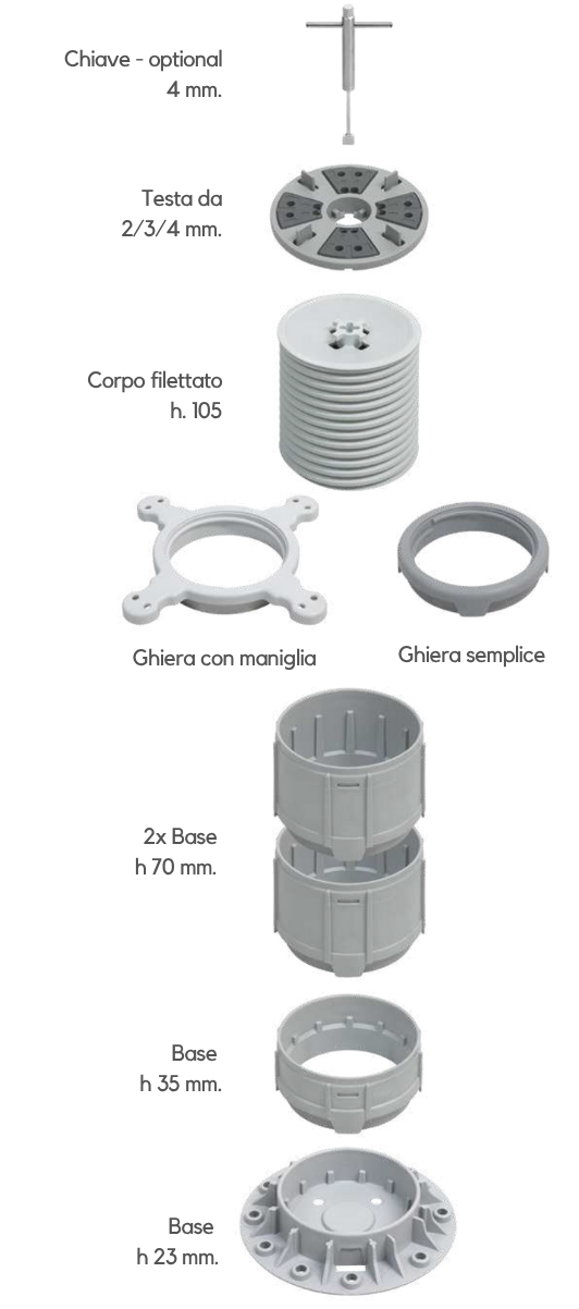Supporto regolabile per pavimenti composto da tre moduli e un’estensione agganciabile.