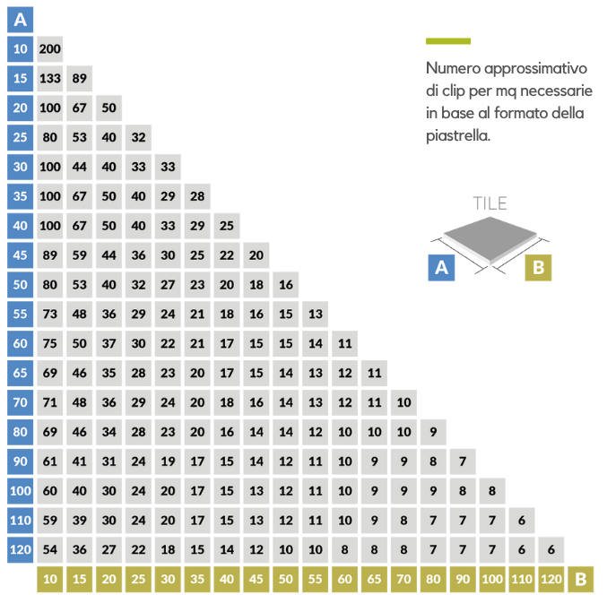 | Codice | Larghezza fuga | Colore | Spessore piastrella | Pezzi per confezione | Confezioni per scatola |